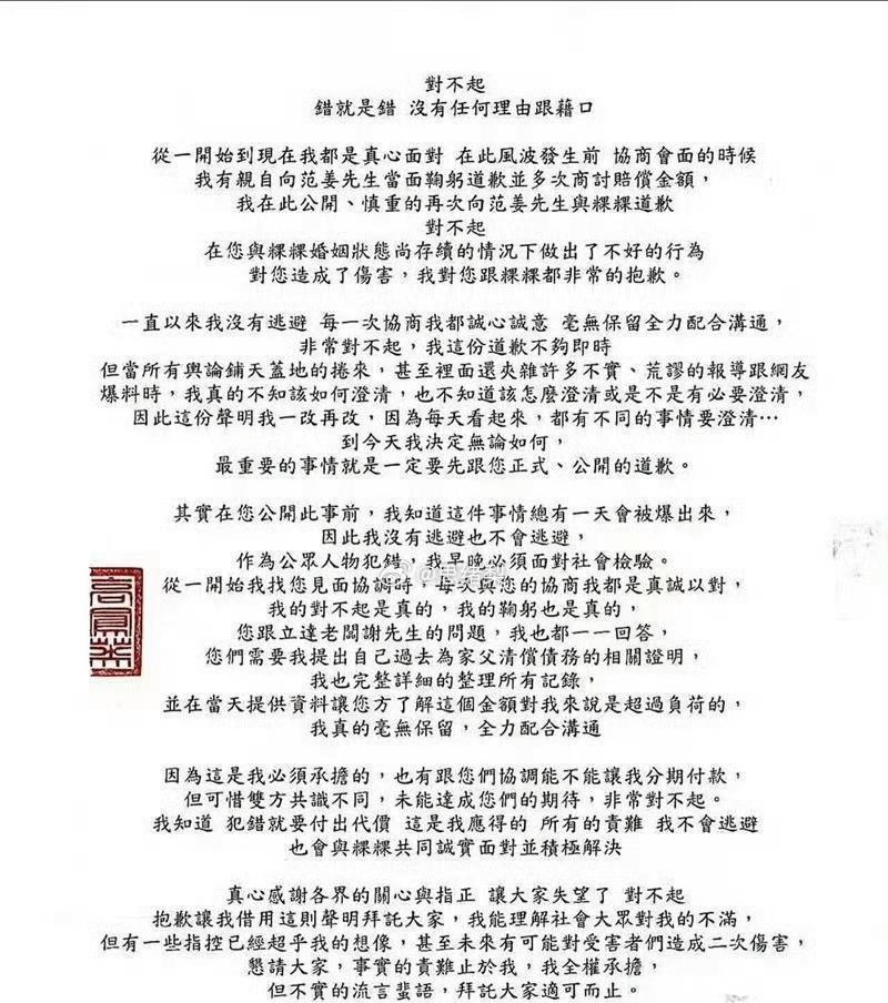 道歉声明核心内容。首次明确承认越界行为,通过律师声明及个人长文,首次承认在范姜与粿粿婚姻关系存续期间存在不当行为:“在您与粿粿婚姻状态尚存的情况下做出了不好的行为,对您造成了伤害”。强调多次向范姜彦丰当面鞠躬道歉,配合提供个人财务资料以证明还款能力,但因对方提出的赔偿金额“超出负荷”,网传超1400万台币且拒绝分期付款,和解未达成。